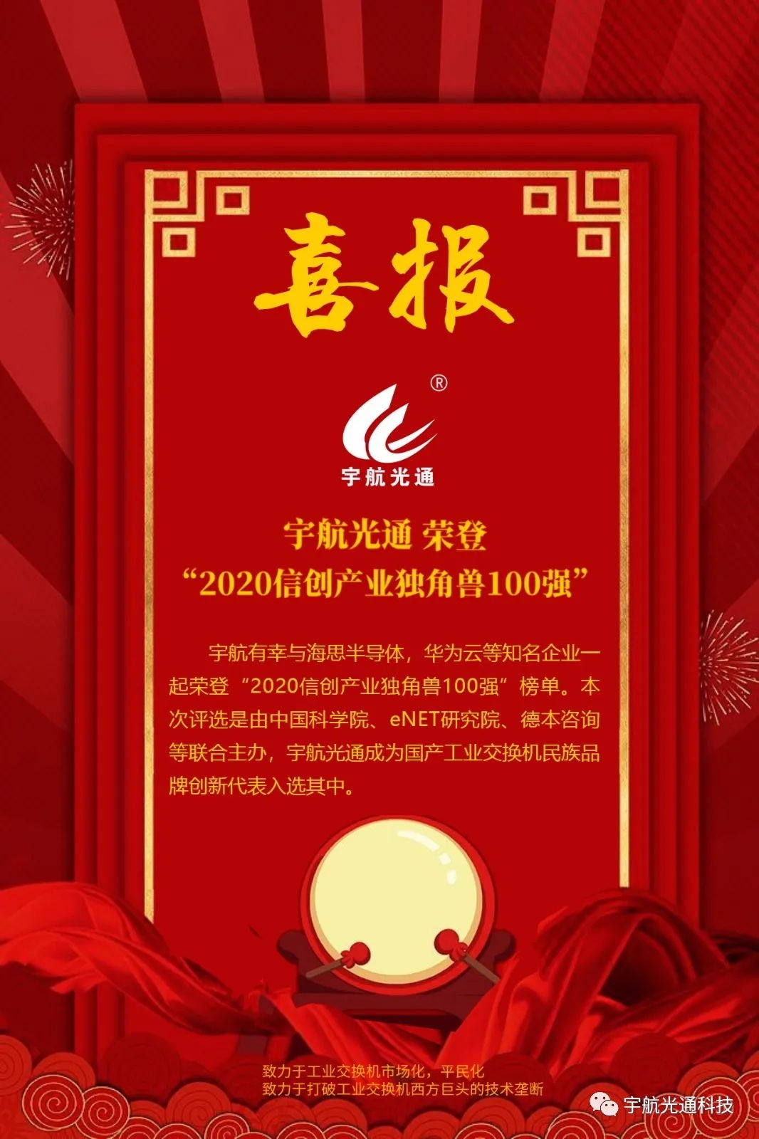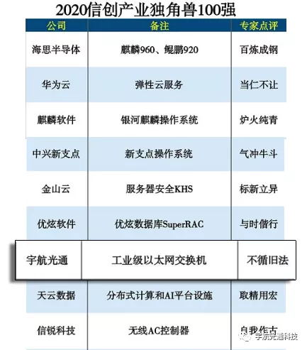 宇航有幸与海思半导体华为云中兴新支点金山云等知名企业一起荣登2020信创产业独角兽100强”榜单。本次评选是由中国科学院《互联网周刊》、中国社会科学院信息化研究中心、enet研究院、德本咨询等联合主办,宇航光通成为国产工业交换机民族品牌创新代表入选其中。