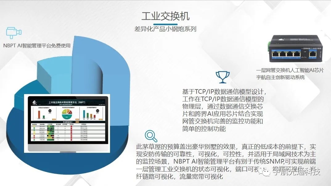 宇航自研一层管理交换机和nbpt ai 智能管理平台,xgp nbpt ai智能平台,用茅草屋的预算盖出豪华别墅的效果。网络状态可视化,端口可视化,终端可视化,光纤链路可视化,流量宽带可视化,让传输看得见、管的精、算得清!